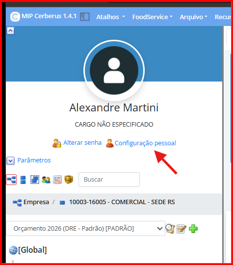 A segunda forma de abrir a “Configuração pessoal” é clicando no seu usuário no rodapé do sistema