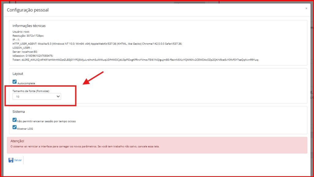 Após alterar o tamanho da fonte, clique em “Salvar”, para que a alteração seja aplicada.